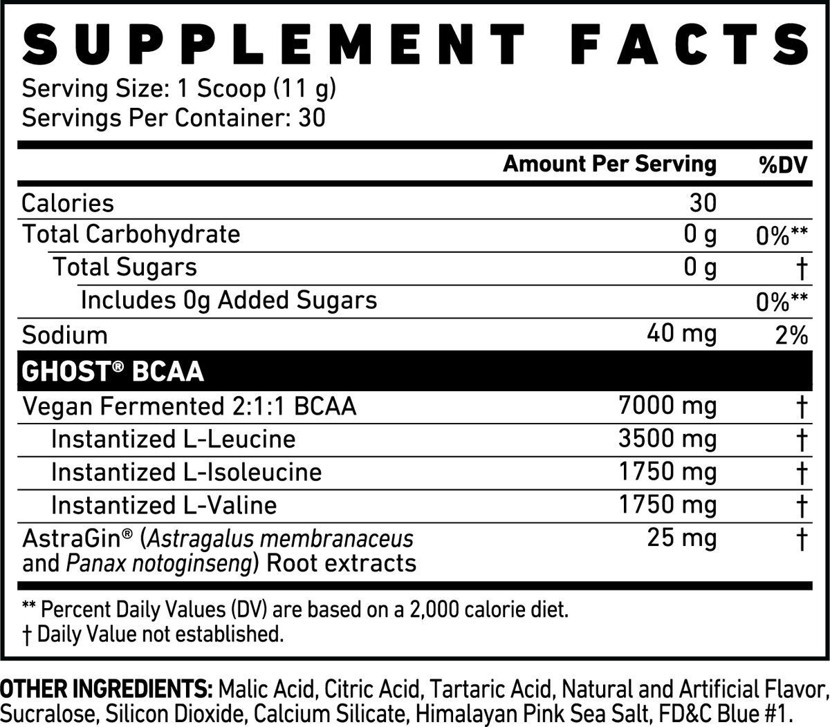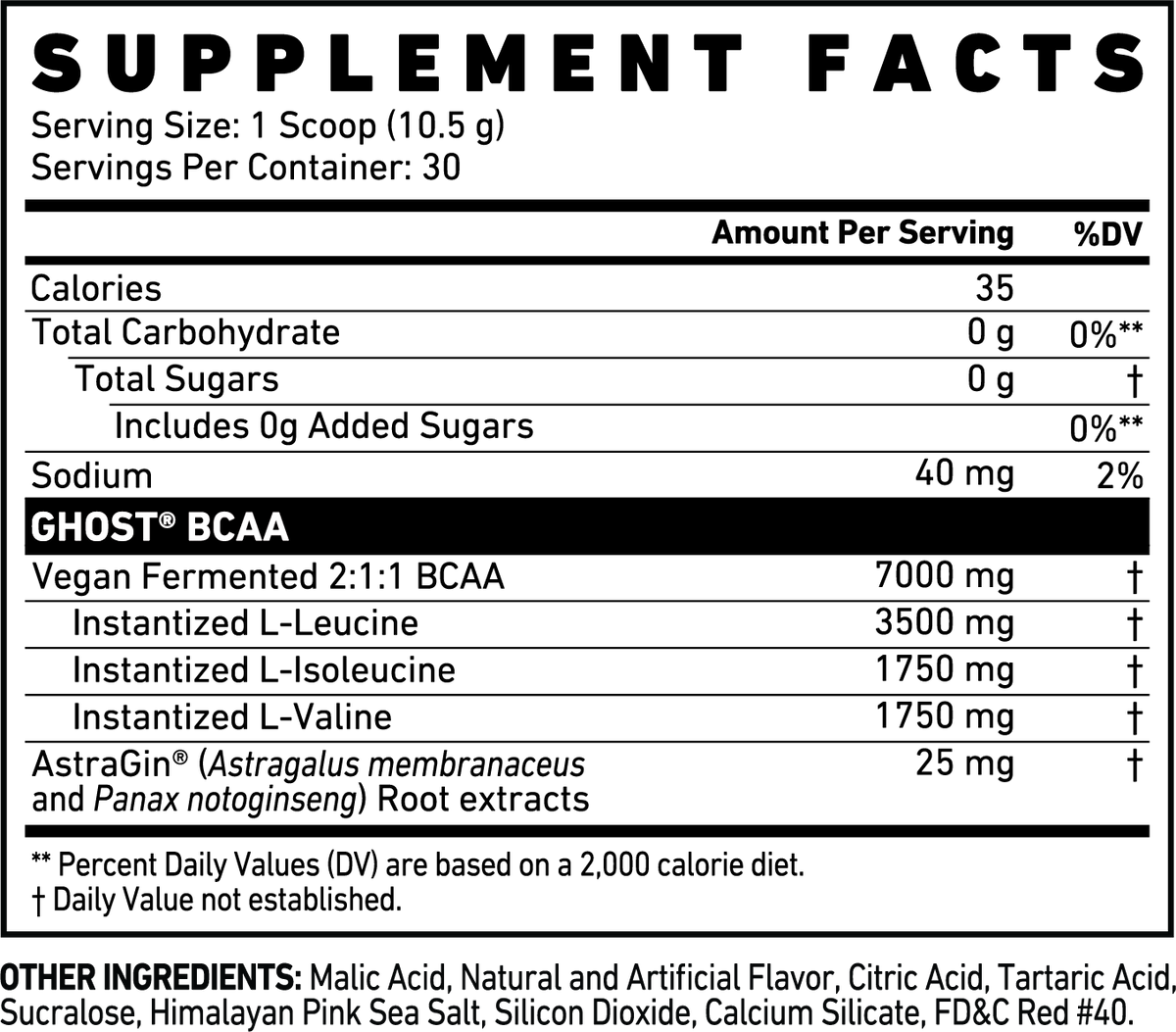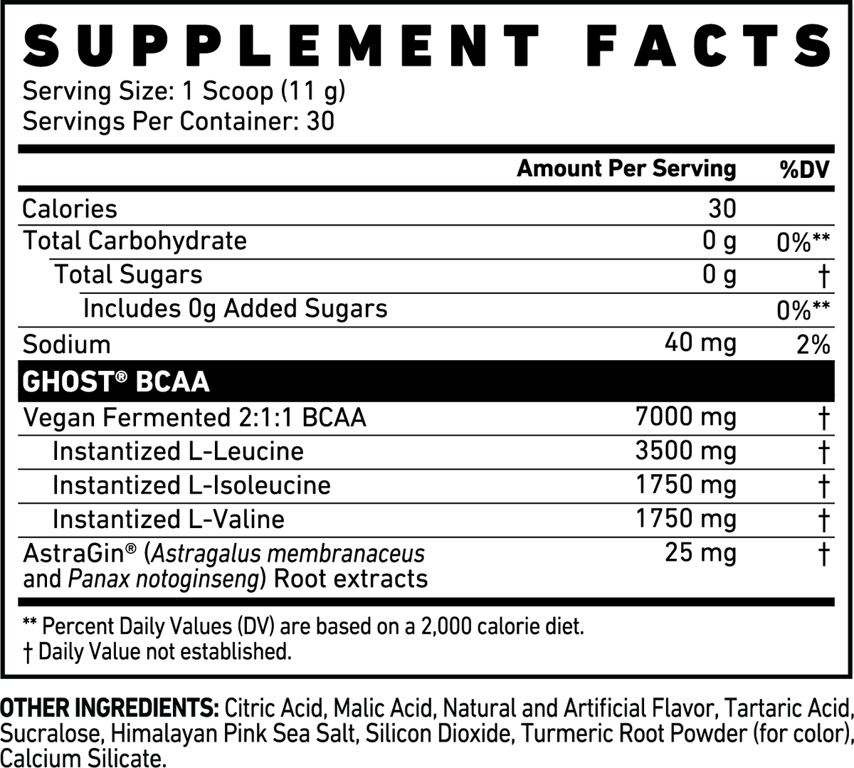 Mix each scoop (serving) of GHOST® BCAA with 8-10 oz of water or beverage of choice. Vary amount of liquid to taste. Consume during or after exercise on training days or throughout the day as a performance thirst quencher.