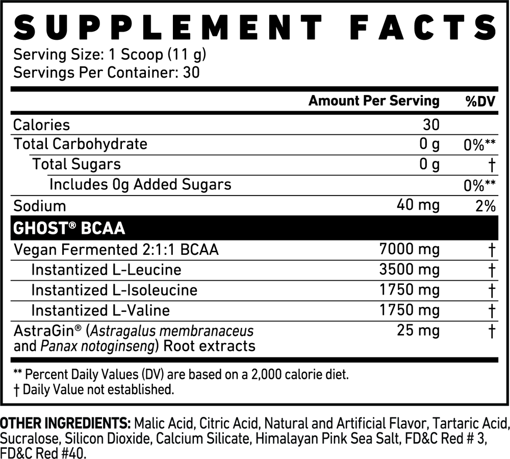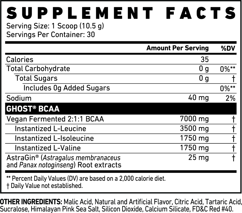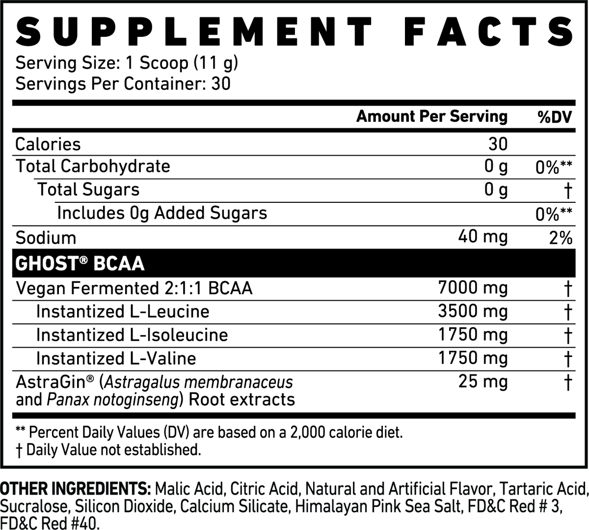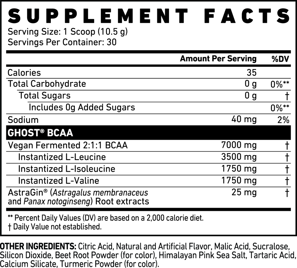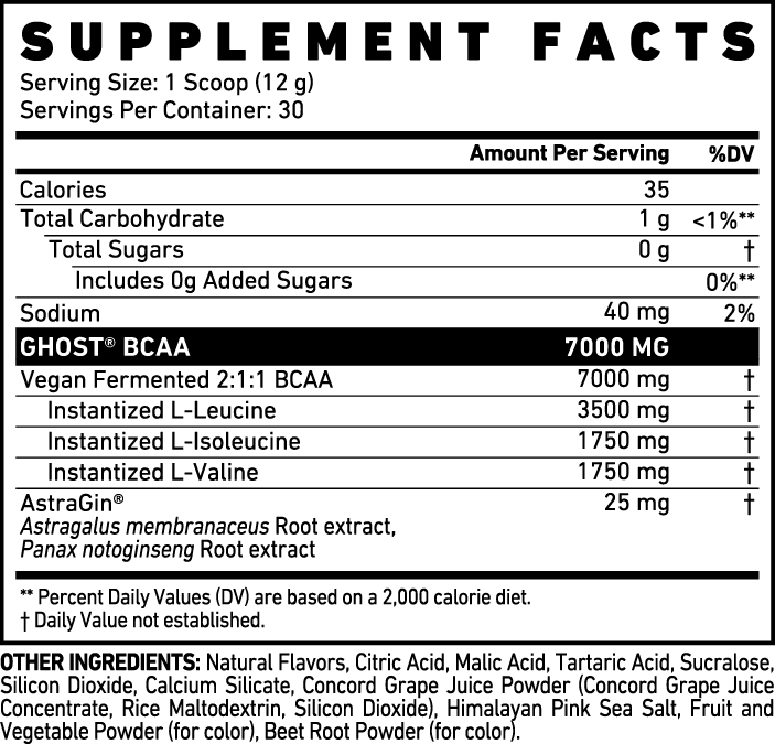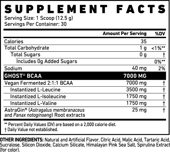 Mix each scoop (serving) of GHOST® BCAA with 8-10 oz of water or beverage of choice. Vary amount of liquid to taste. Consume during or after exercise on training days or throughout the day as a performance thirst quencher.