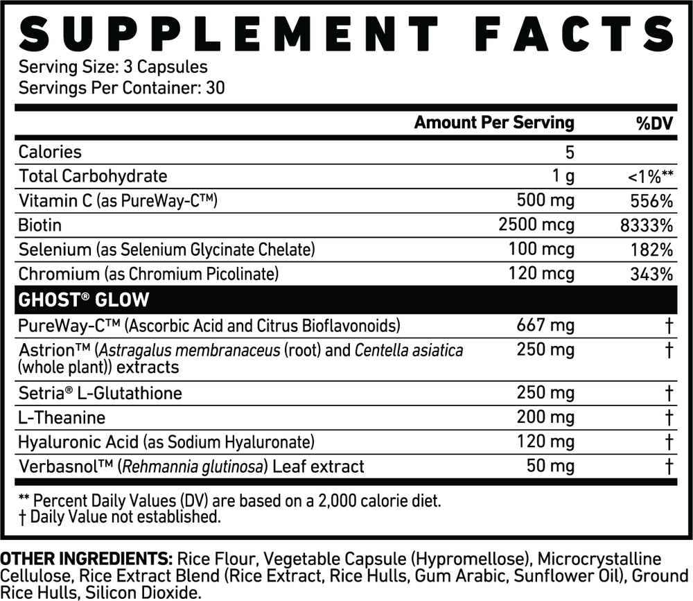 As a dietary supplement, consume 3 capsules (1 serving) of GHOST® GLOW with food and water. Integrate with your daily skin care regimen and drink plenty of water.