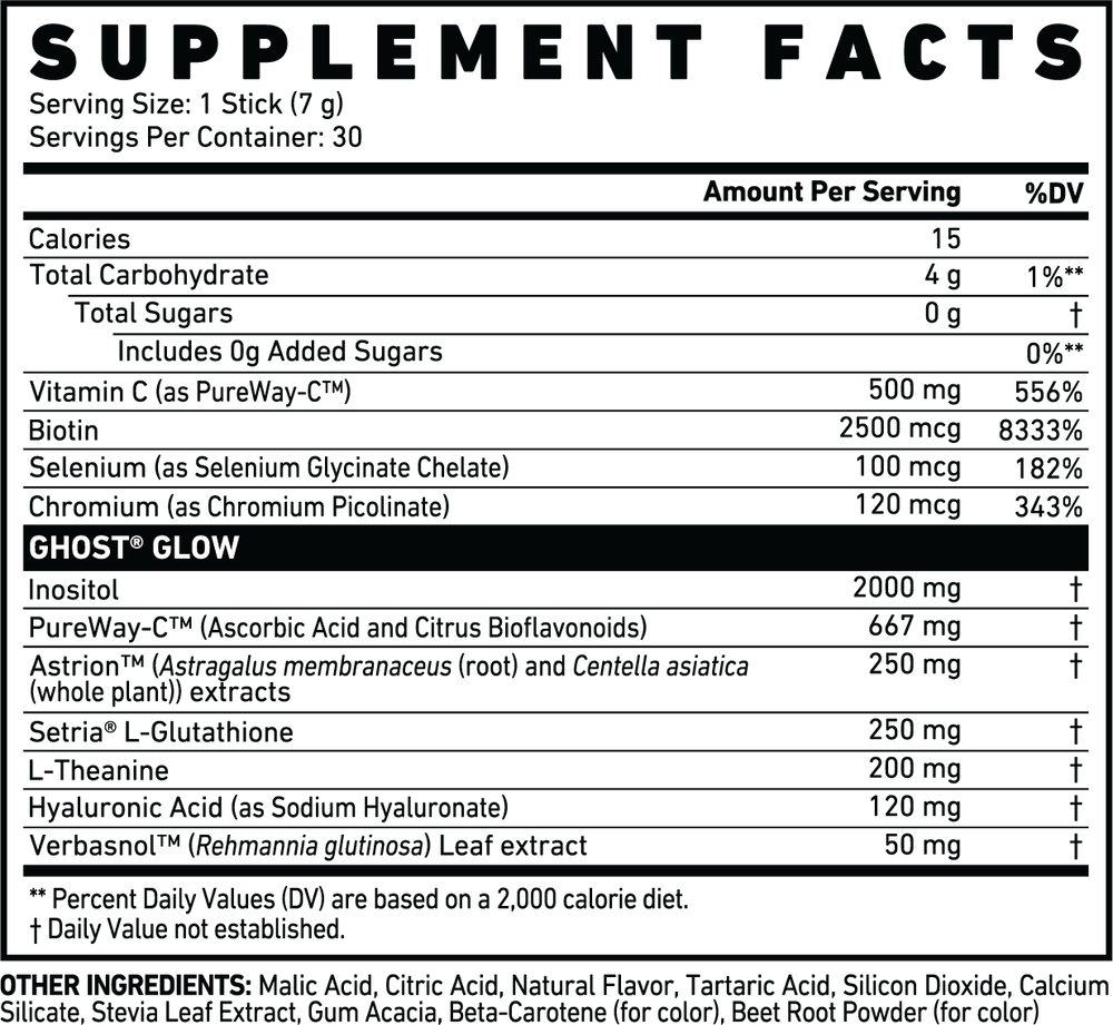 As a dietary supplement, mix one stick (1 serving) of GHOST® GLOW with 8-10 oz of water or beverage of choice. Vary amount of liquid to taste. Integrate with your daily skin care regimen and drink plenty of water.