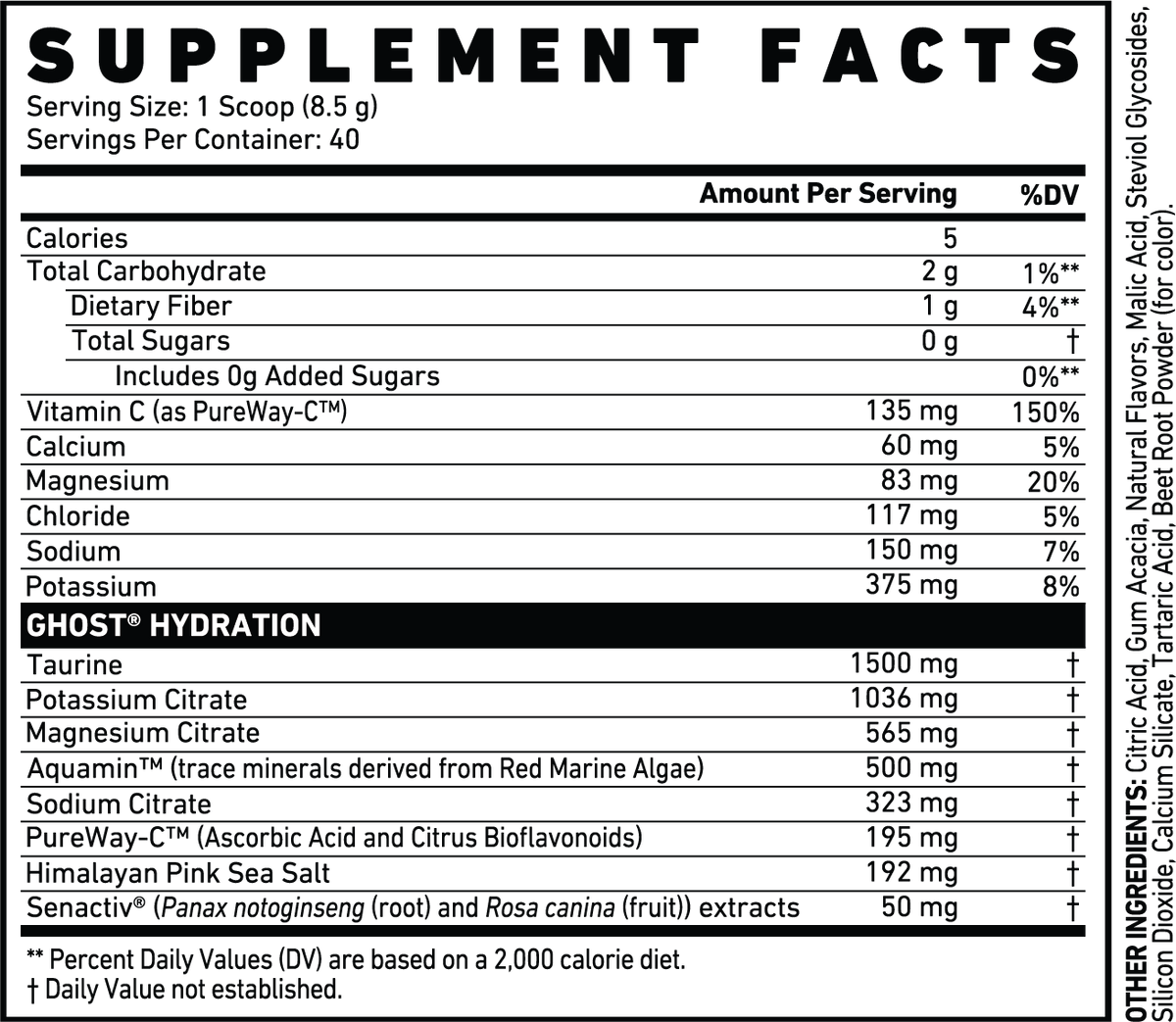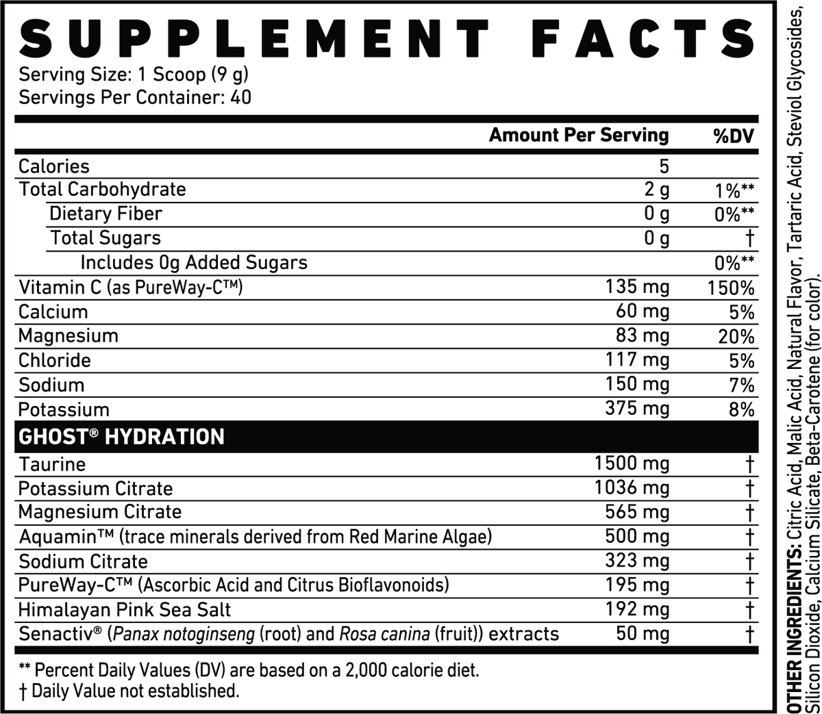Mix each scoop (serving) of GHOST® Hydration with 12-14 oz of water or beverage of choice. Vary amount of liquid to taste. Consume during or after exercise on training days or throughout the day as an electrolyte thirst quencher.