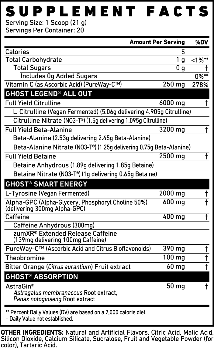 Mix one scoop (1 serving) of GHOST LEGEND® ALL OUT with 10-12 oz of water or beverage of choice. New users, and those sensitive to stimulants, should start with 1/2 serving (1/2 scoop) to assess their personal tolerance. Consume prior to exercise on training days.