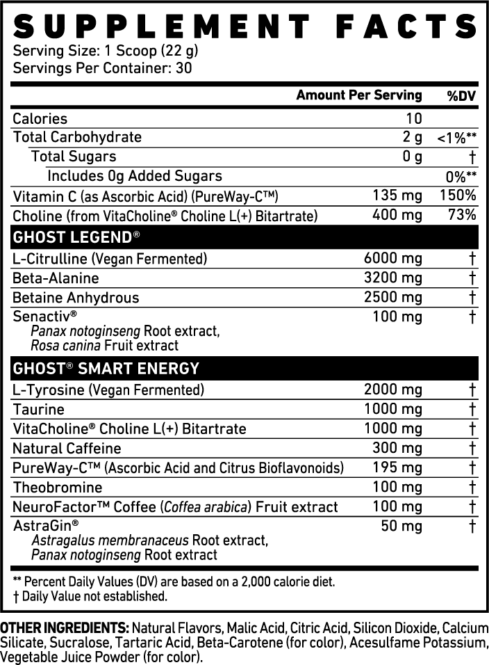 Mix 1 stick (1 serving) of GHOST LEGEND® with 8-10 oz of water or beverage of choice. Vary amount of liquid to taste. Start with 1/2 stick to assess your tolerance. Consume prior to exercise on training days.